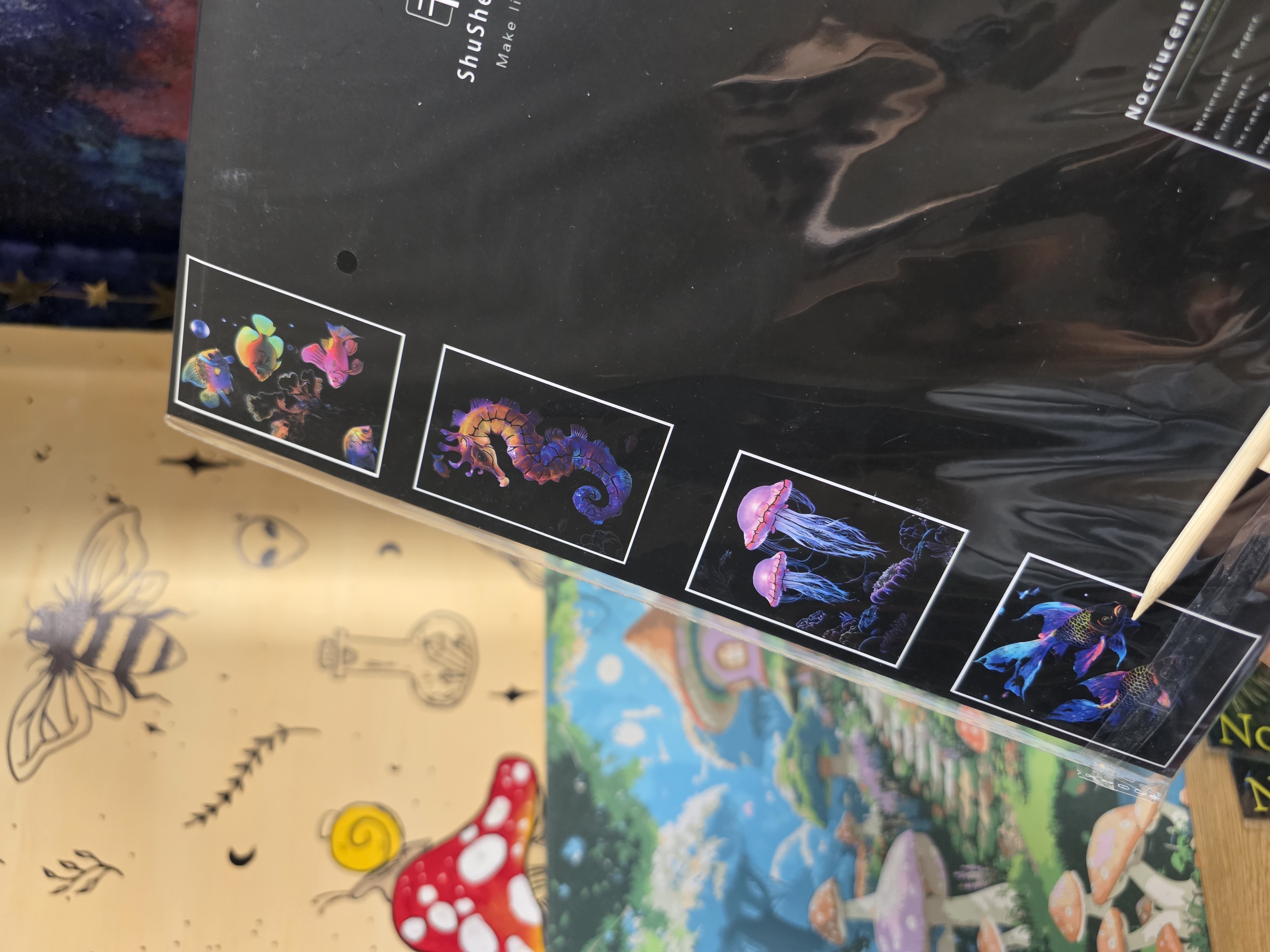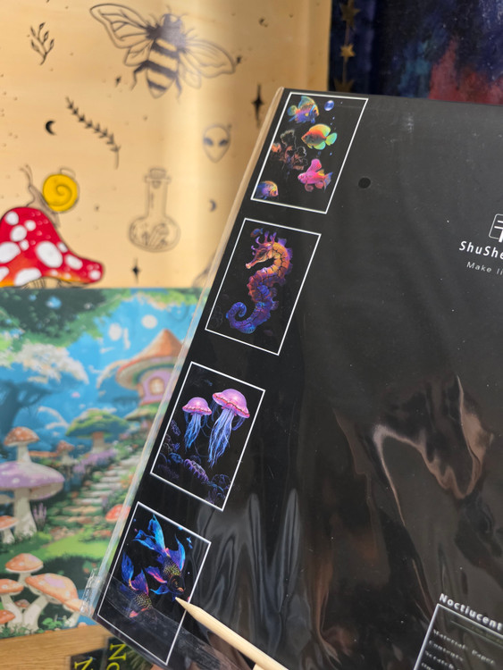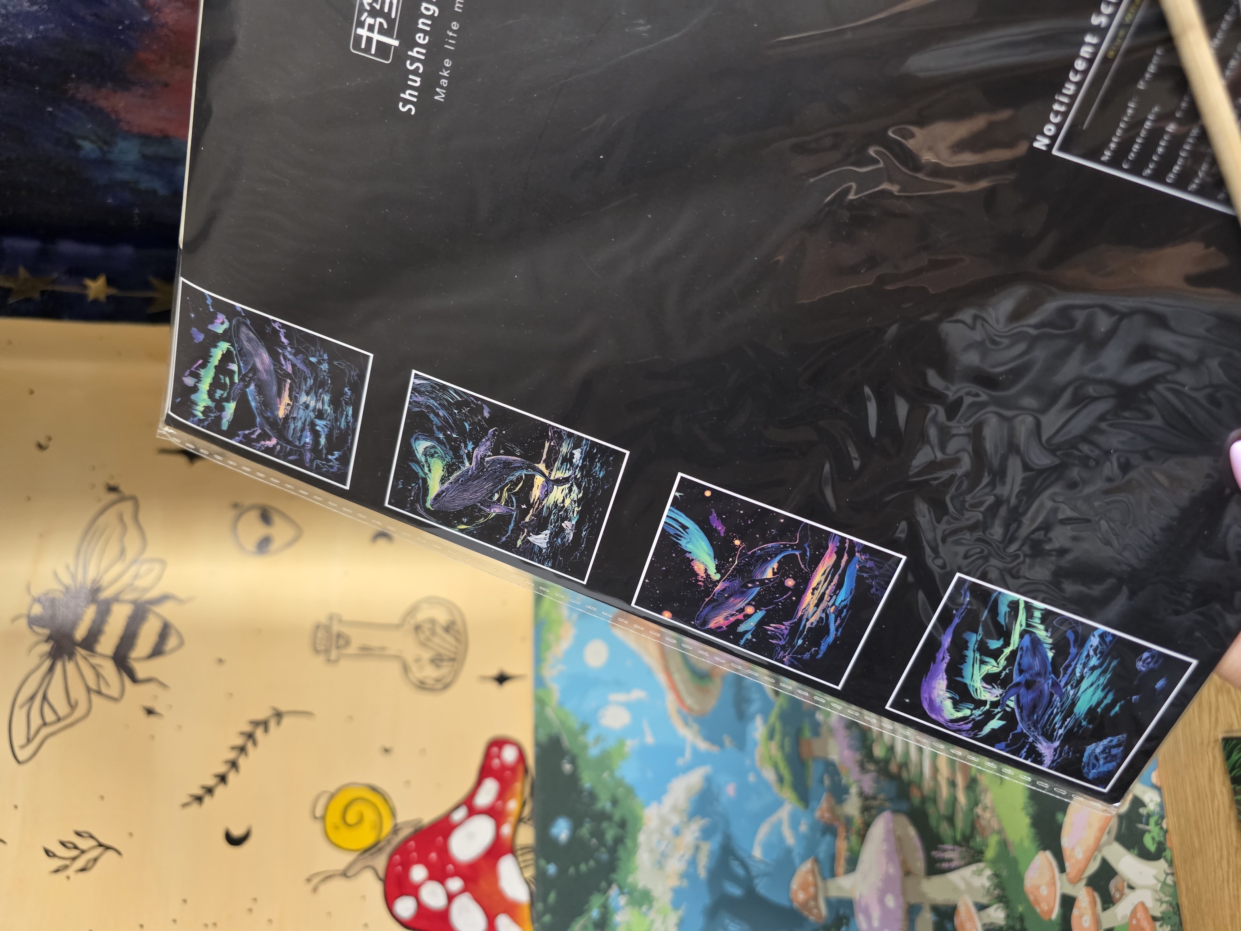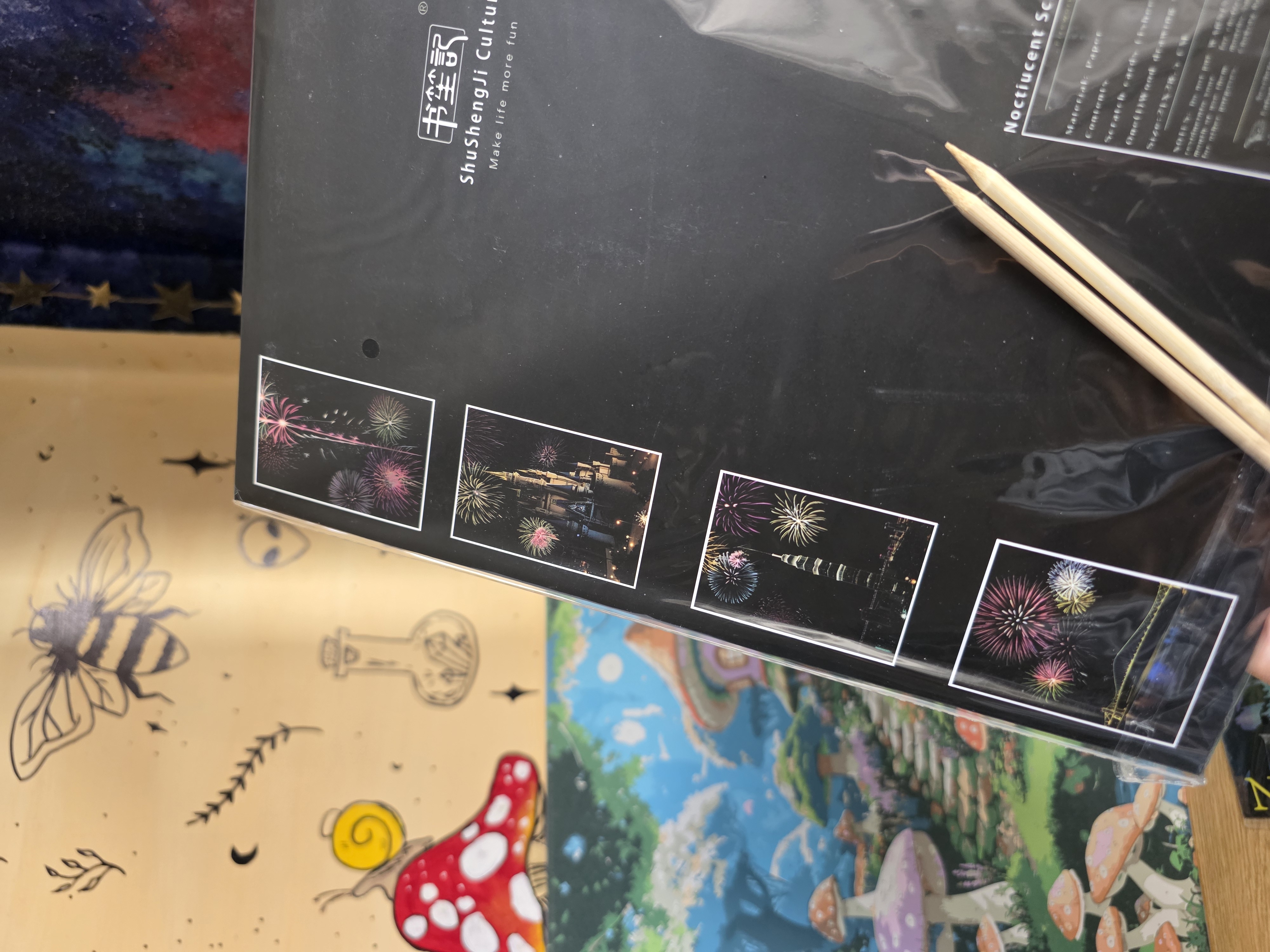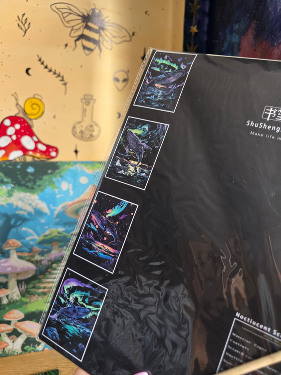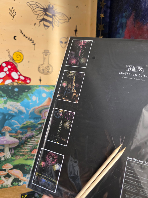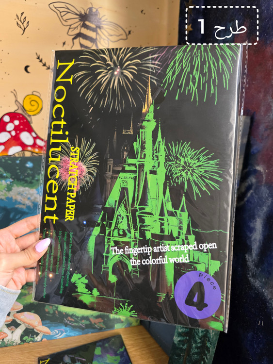 نقاشی اسکرچ یا خراشیدنی یک صفحه ی سیاه که به وسیله ی دو عدد چوب که داخل پک وجود دارد سیاهی را میتراشی تا طرح نمایان شود